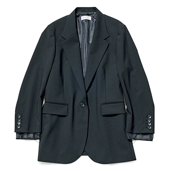 黒ワイドジャケット 61,600円/SEA(エスストア) オーバーサイズを単なる「ゆるさ」に見せない秘訣は、肩のラインにあり。パッドが生む直線的なフォルムが、コンサバになりがちな黒ジャケットをモードな表情へと引き上げる。えりは細く仕立てたことで、着るとイメージよりもすっきりとした印象に。パッドは取り外し可能で、気分に合わせてシルエット調整も自在。ウール100%の上質素材。