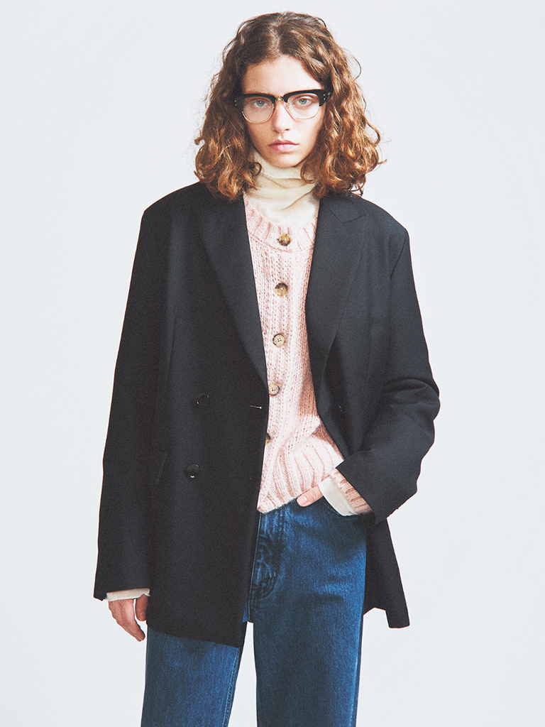 シルエットがくずれにくい、ふっくら感とハリを持つウールモヘア素材のジャケット。ニットの上に羽織れるゆるさながら、黒ジャケット特有のキレは維持。インナーには愛らしい色ややさしく見えるデザインで強弱をつけると、定番のジャケット+デニムがありきたりに見えないこなれ感が誕生。