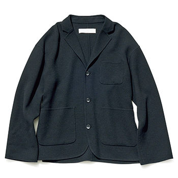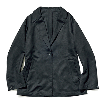 黒ノーカラージャケット 71,500円/Graphpaper(グラフペーパー 東京) 身幅はスリムなのにお尻が隠れる長さがあり、コートに近い整え力を確保。首まわりは直線的で、すそに向かうにつれ曲線を描くラインが、ミニマルな黒に女性らしいしなやかさを加味。動作をじゃましない適度な厚みで、1枚はもちろんコートの中に仕込んでも窮屈感はなし。