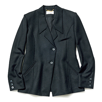 ビッグジャケット 104,500円/アキラナカ 肩パッド入りで身幅は広め。前を閉じるとウエストが締まり、テクニックに頼らずスタイルよく。鋭いラペルデザインが、ダークカラーでも地味に見せない静かな攻め気を演出。