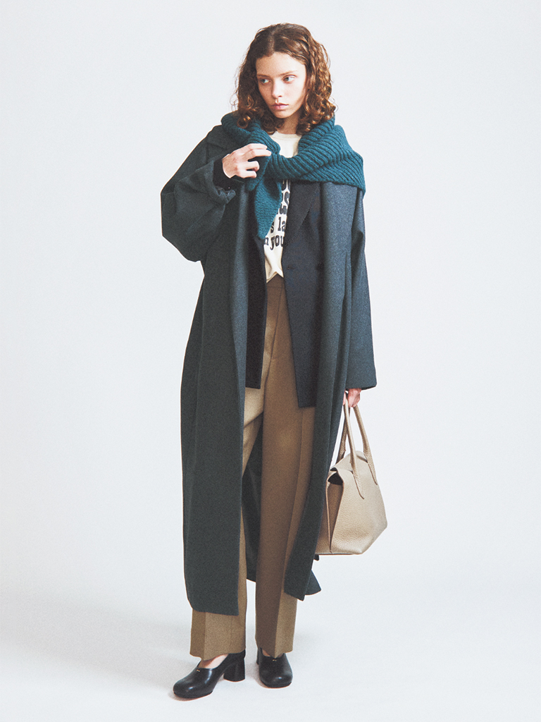 黒ジャケットは着まわし。コート 33,000円/AKTE ロゴスウェット14,850円/MIXTA(メイデン・カンパニー) パンツ 35,200円/トラディショナル ウェザーウェア(トラディショナル ウェザーウェア 渋谷店) ストール 22,000円/BATONER バッグ 75,900円/イアクッチ(イアクッチ 大丸東京店) パンプス 17,600円/ダイアナ(ダイアナ 銀座本店)