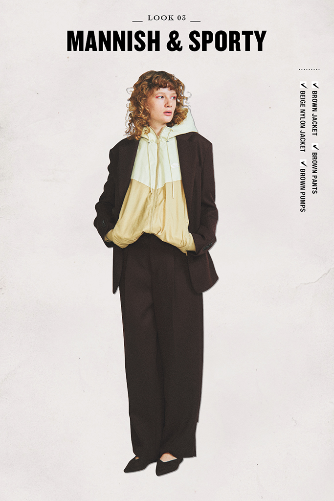 全部メンズライクな組み合わせはマイルドな配色でやさしげに