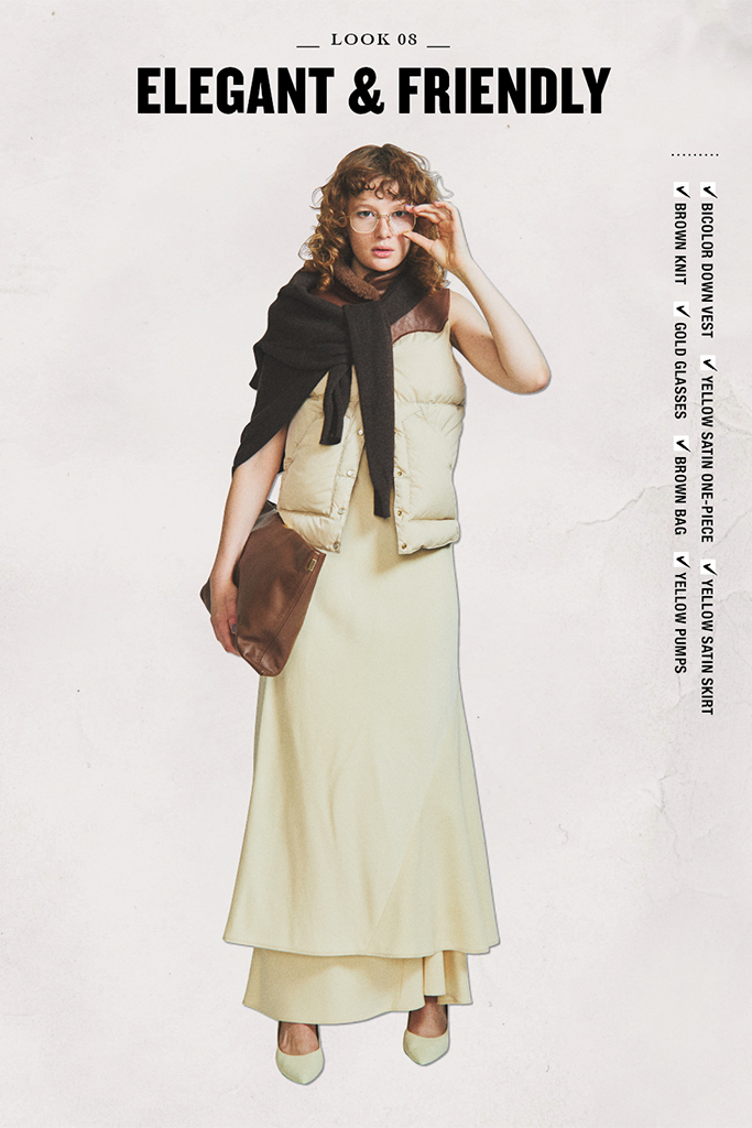 小物感覚で使えるコンパクトなダウンベストを重ねて、優雅なワンピースを日常に引き寄せ。しなやかなサテン地とふかふかとしたダウン。テンションの異なるやさしい素材どうしで、キレイとかわいいを兼ねそなえる理想の女性像も手に入る。