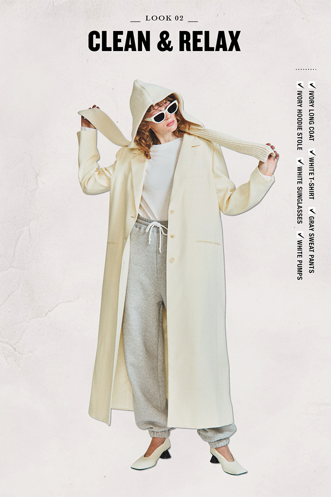 ドレスに近い華やかさがある、白系のキレイなチェスターコート。それだけで十分インパクトがあるから、ルーズなスエットパンツでわかりやすく力を抜くぐらいがちょうどいいあんばいに。ハイウエストのスエットパンツで腰位置を上げて、長く直線的なコートにメリハリを意識。白っぽい色でそろえると洗練度がアップ。