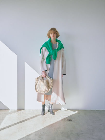 空気をはらむくすんだ白の明度を上げるように高発色のニットを肩巻き。はっきりしないコートの空気を変えるフレッシュなグリーンのアクセント。