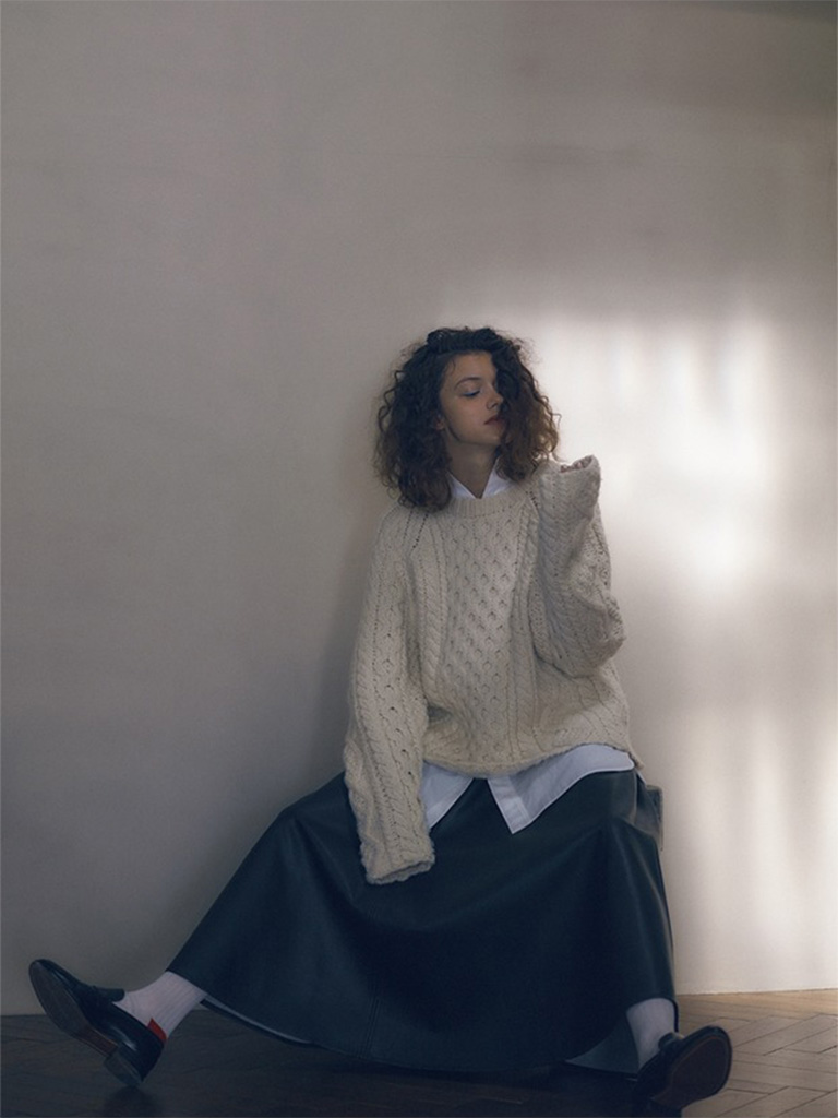 かつては毎日着ていたようなハート柄のチャンキーニットも白がいちばん似合うはず。Iラインのレザースカートで余分な甘さをカットすると、いまに似合うなつかしさに着地。