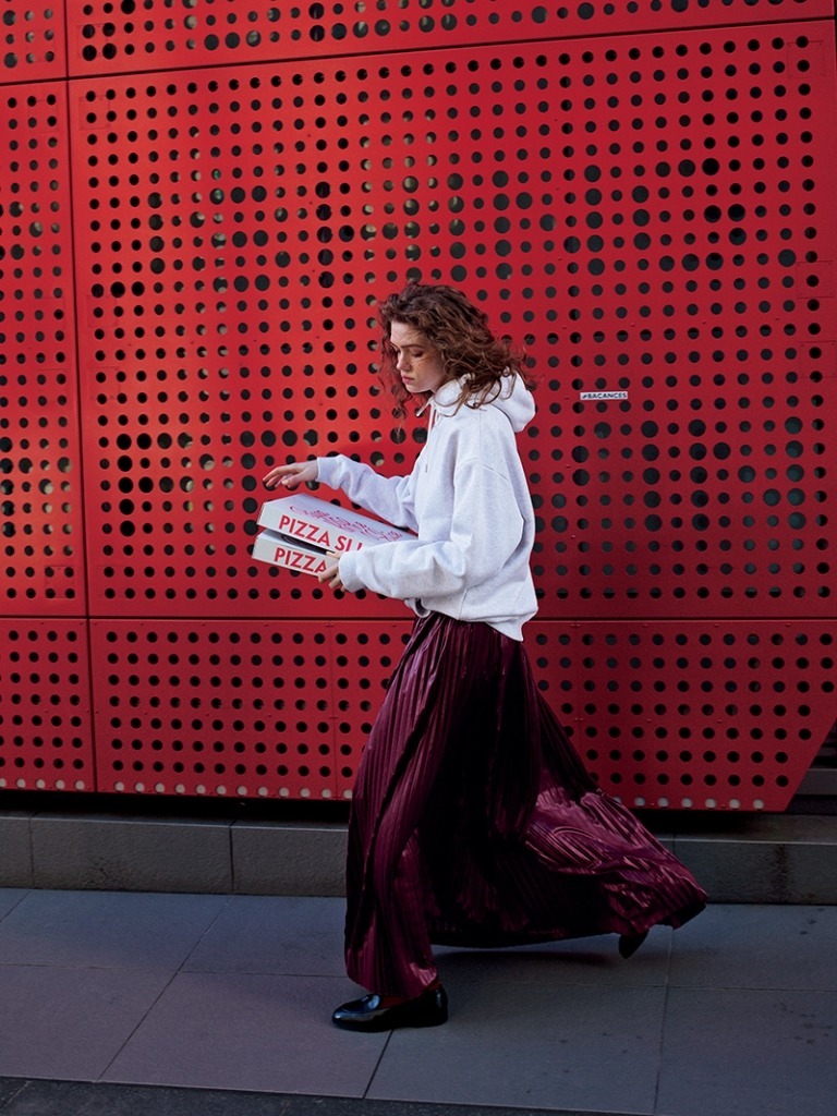 動作とともにひらつくボルドースカートで、パーカでラクする日もレディなまま。色・シルエット・質感すべて女っぽいから、トップスはカジュアルに仕上げるぐらいがちょうどいいバランスに。