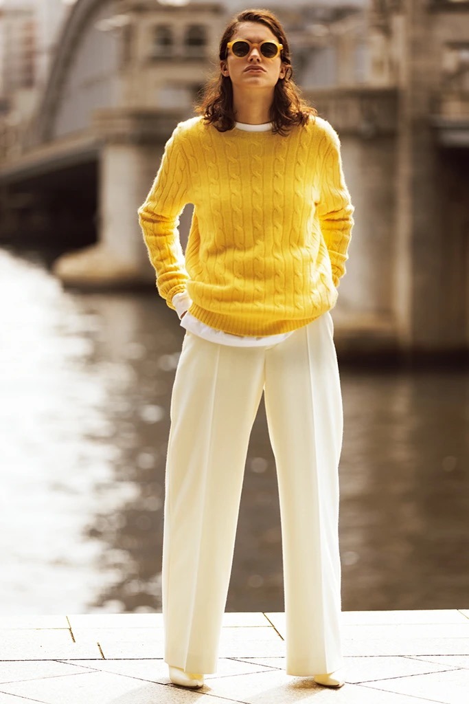 強気な発色でも派手に見えない、白とトーンの近いイエロー。親しみやすいケーブル編みニットのやわらかな質感が端正なストレートパンツの力みをそぎ、調和のとれたカラーコーディネートへ整う。