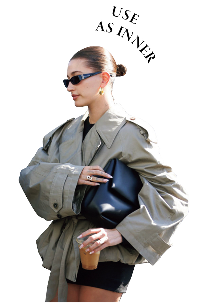 「世界的なファッションアイコン、ヘイリー・ビーバーのニットを女っぽく着こなす姿が気になります。ボリューミィなコートの下からぴたっとした黒ニットをのぞかせるだけで、正統派トレンチに強気な女っぽさが。」(スタイリスト・塚田綾子さん @ayakotsukada)