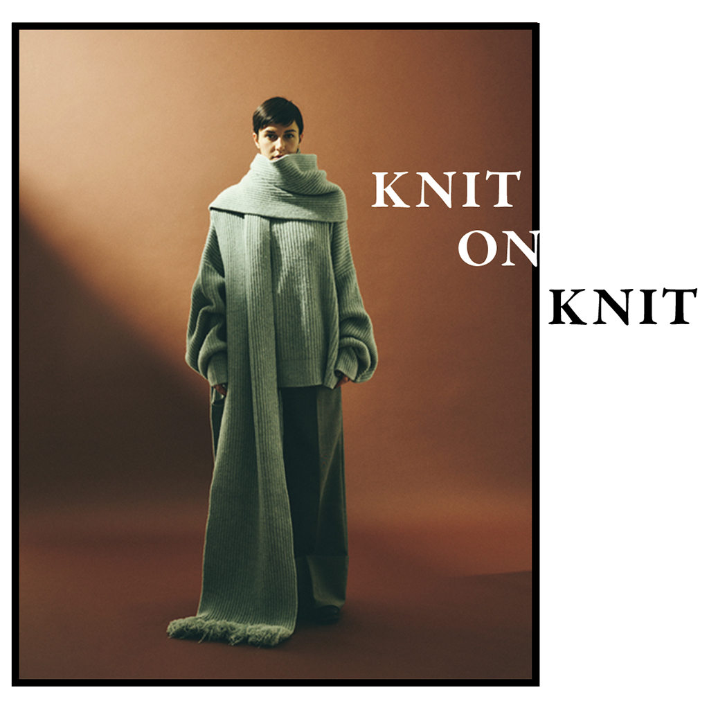 「RIM.ARKの新ライン『TRANQUILITY』の、身幅もそでもゆったりとしたニットトップスに、同素材のストールを巻いた、迫力のある“ほぼニット”のルックがかわいい。ロング丈のストールをたらした、ムーディな雰囲気も好きです。」(RIM.ARKデザイナー・中津亜佳音さん @akane__nakatsu)