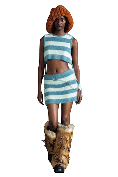 「職業柄、仕事中はモデルさんの顔にニットの毛がつくのが気になるので、ふだんは小物でとり入れるのが私的定番。AKANE UTSUNOMIYAで目を引いた、ボリューミィなニット帽を用いたルックは、メイクはツヤ感のあるリップだけにおさえた潔いミニマルさも魅力的でした。」(ヘア&メイク・淡路美里さん @misatoawaji)