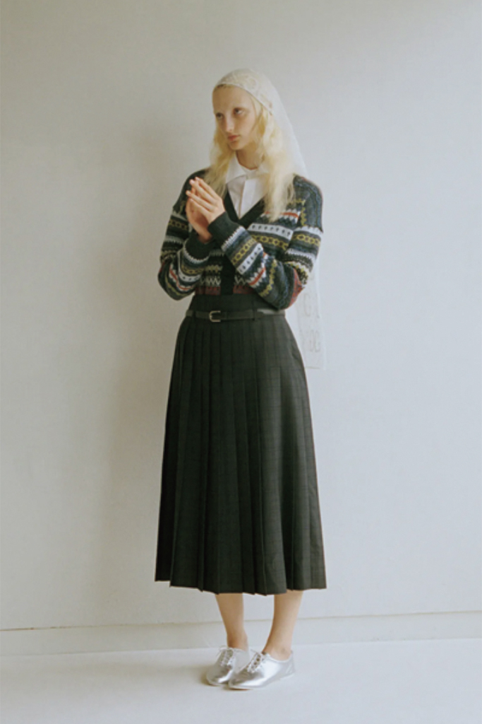 「装いの主役になる柄やジャカードニットを、まじめなスタイルにとり入れるのが今季の気分。この秋新たなブランドとしてスタートした、『Glyph』の幾何学的なフェアアイル柄ニット。プレッピーなプリーツスカートや白シャツをレイヤードして、派手なニットときちんと感のギャップを楽しみたい。」(Glyph/Hedie.+ コンセプター、デザイナー・西垣美奈さん @__minanishigaki)