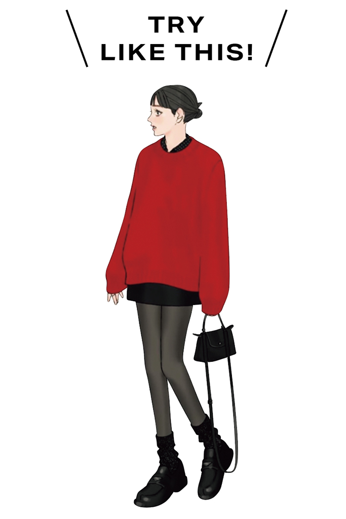 赤ニットに重ねた同色のチュールやバッグのファーで、単に派手色に頼っただけじゃない意図のあるニュアンスを装いにプラス。結果、赤とレザーがそれぞれを浮かないよう中和し合う相互作用を発揮。