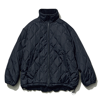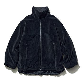 「見た目からもあたたかなフリースと、ダウンらしいキルティングとのリバーシブル。選べる2質感でボリュームを調整でき、ボトムとのバランスも良好。すそのドローコードで形も変化。」(スタイリスト・船戸さん) お尻をすっぽりと隠すミドル丈。無地の黒でもマンネリはなし。締まったそで口で冷気も防げる。 26,400円/MANOF
