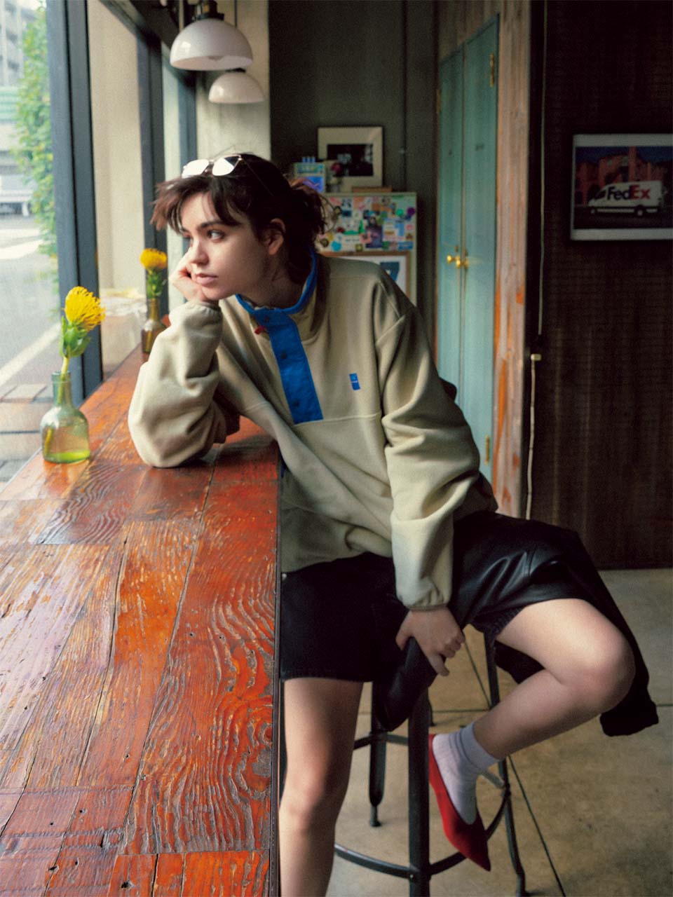 【POINT】。肌ざわりのいいふわふわとした風合い、 1枚でさまになるうえ、ニットよりも気楽に着られてアクティブな印象に。ボトムも軽快なハーフパンツで、やんちゃな男のコをイメージ。