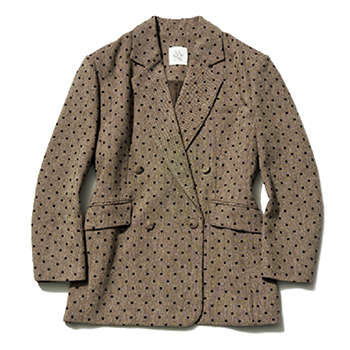 合わせる服を選ばない、グレーベースに細かなドットを配した着回しやすい柄のセットアップ。メンズライクなダブル&ほどよいゆったり感で、コートの中に着ても、アウターとしても活躍。同素材のくるみボタンがアクセント。