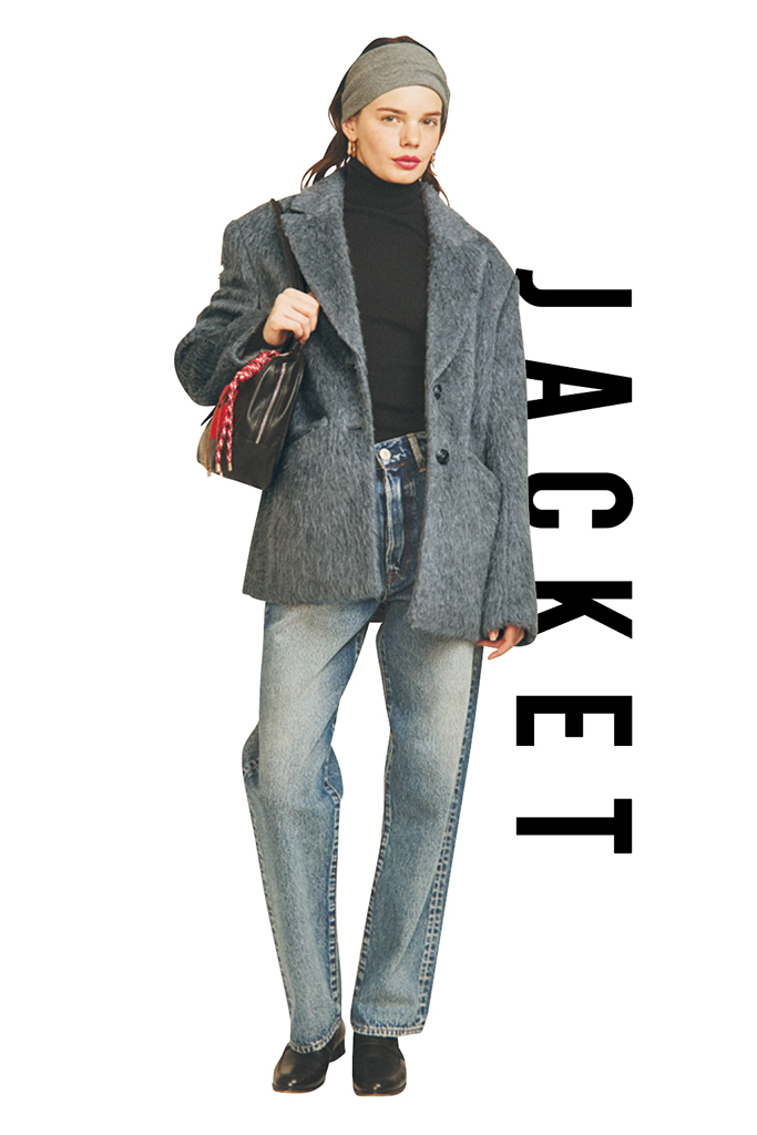 ふわっとやわらかい起毛感をそなえるジャケットコート。白も感じるグレーが、おかたくなりすぎない抜け感のあるハンサムスタイルを確立。肩パッド入りでさらにスマート。