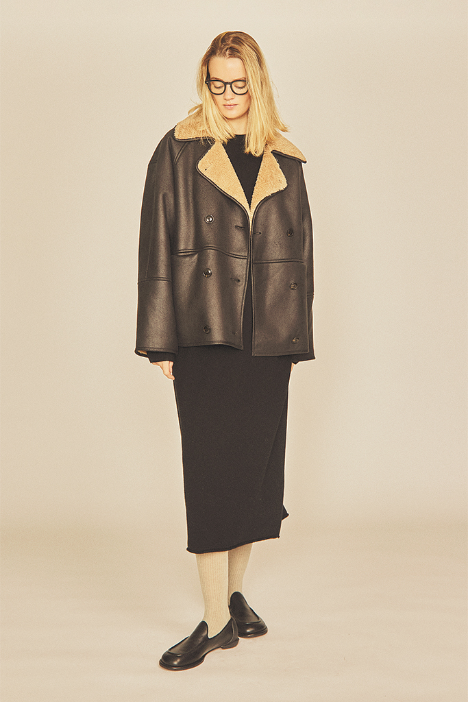 黒ニットワンピースは着まわし。レザームートンジャケット 22,000円/Mila Owen(ミラ オーウェン ルミネ新宿2店) 眼鏡 54,780円/Oliver Peoples(ルックスオティカジャパン カスタマーサービス) タイツ 5,500円/ブルーフォレ(LITTLE LEAGUE INC.) シューズ 37,400円/SHISEI(アイネックス)