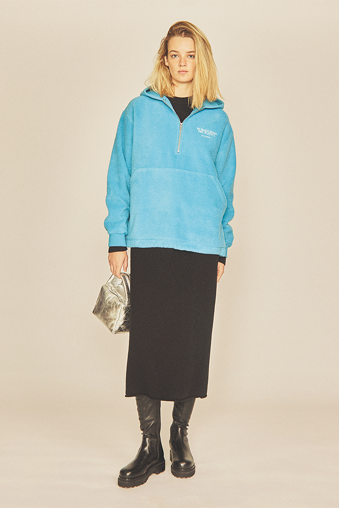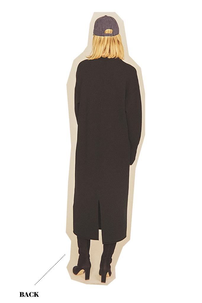 メリハリがつくのに肉感は拾いにくい、下半身に少しゆとりを持たせた地厚な生地の構築フォルム。手元を隠すほどの長いそでが、細身の緊張感をゆるめる抜けをもたらしてくれる。