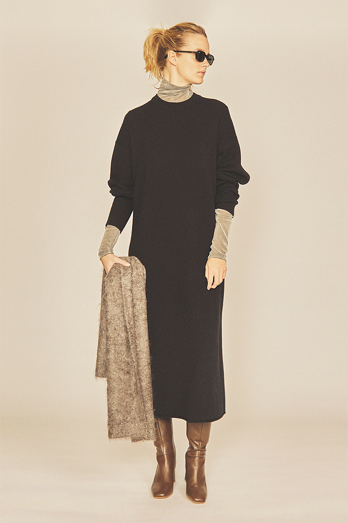 黒ニットワンピースは着まわし。中に着たタートルトップス 14,300円/アルアバイル サングラス 24,420円/Ray-Ban(ルックスオティカジャパン カスタマーサービス) 手に持ったストール 75,900円/アソース メレ(アイネックス) ブーツ 42,900円/ダイアナ(ダイアナ 銀座本店)