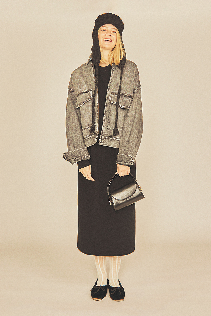 黒ニットワンピースは着まわし。デニムジャケット 48,400円/グラフペーパー(グラフペーパー 東京) フライトニット帽 13,970円/CA4LA(CA4LA プレスルーム) タイツ 1,650円/靴下屋(タビオ) バッグ 10,900円/CHARLES & KEITH(CHARLES & KEITH JAPAN) バレエシューズ 37,400円/PIPPICHIC(ベイジュ)