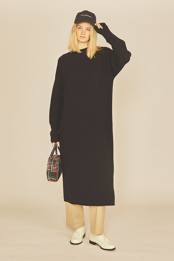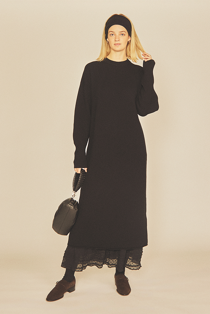 細すぎずゆるすぎず、ニットだけどスマートさを保てる直線的な黒の丸首。毛羽立ちも少ないためシーンレスに活躍。足首がのぞく丈+後ろにスリット入りで、ソックスやブーツなどで足元の変化が楽しめ、ボトムレイヤードも簡単。自宅で洗えて手入れもラク。