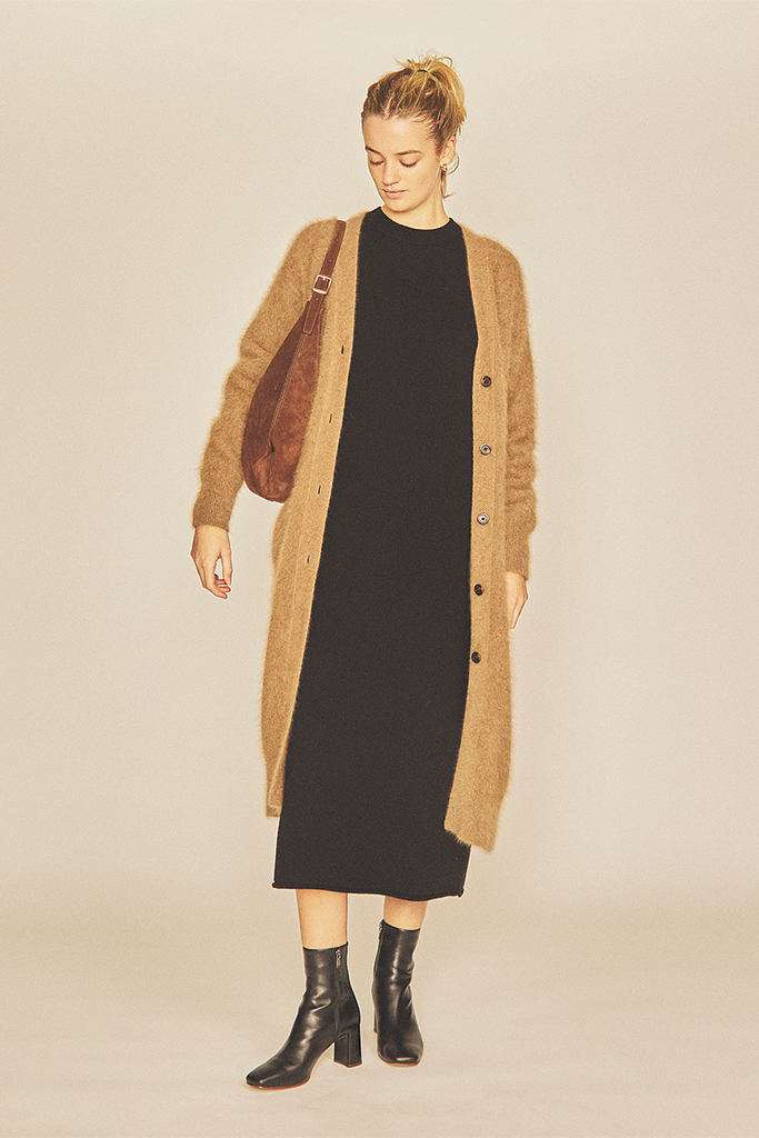 黒ニットワンピースは着まわし。カーディガン 83,600円/l’heritage martinique(マルティニーク ルミネ横浜) ピアス 9,130円/LUV AJ(ZUTTOHOLIC) バッグ 33,100円/LUMEN(ピーアールワントーキョー) ブーツ 28,600円/ダイアナ(ダイアナ 銀座本店)