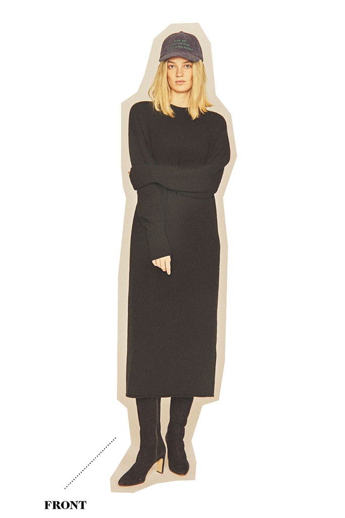 黒ニットワンピ―ス(WEB限定) 17,600円/SLOBE IENA(SLOBE IENA 自由が丘店) キャップ 3,960円/CITEN(ユナイテッドアローズ カスタマーサービスデスク) ブーツ 44,000円/ダイアナ(ダイアナ 銀座本店)