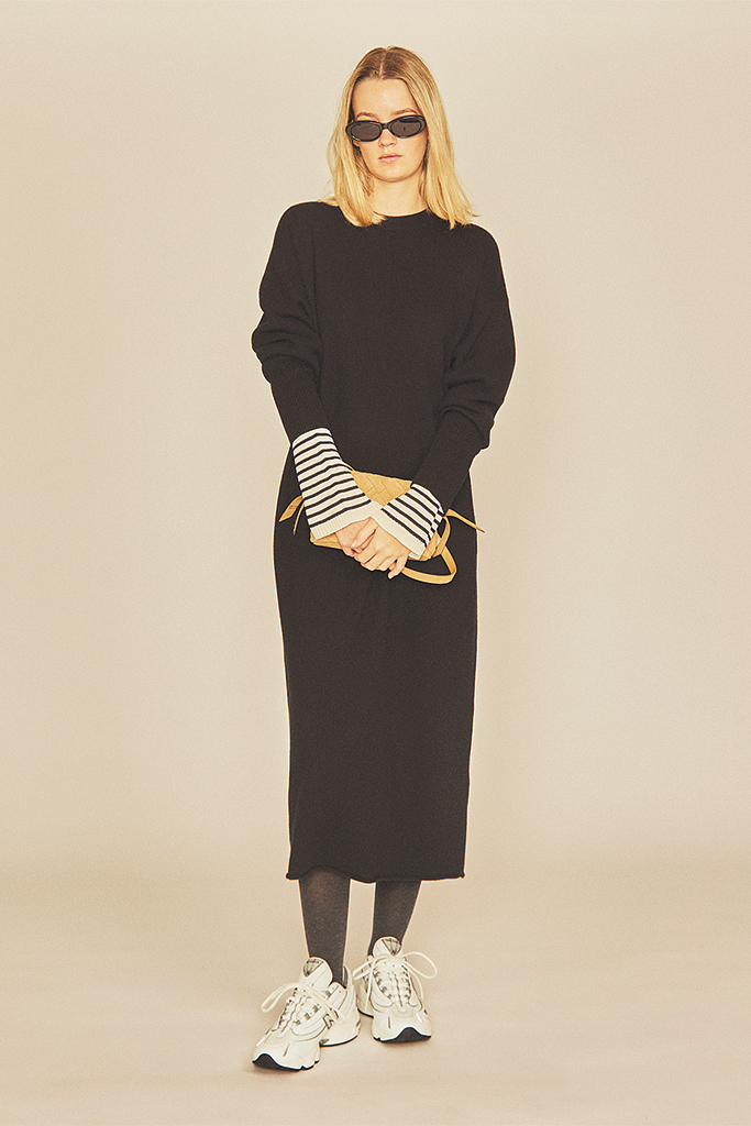 黒ニットワンピースは着まわし。中に着たボーダーニット 27,500円/Bed&Breakfast(グリードインターナショナル) サングラス 16,500円/STATUS ANXIETY.(ジャック・オブ・オール・トレーズ プレスルーム) タイツ 4,400円/ブルーフォレ(LITTLE LEAGUE INC.) バッグ 15,900円/CHARLES & KEITH(CHARLES & KEITH JAPAN) スニーカー 19,800円/New Balance(ニューバランスジャパンお客様相談室)