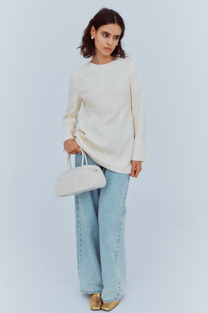 ライトブルーデニムパンツは着まわし。オフ白ノーカラープルオーバー 39,600円/デ・プレ パールイヤリング 13,200円/アビステ バッグ 14,300円/TSURU By MARIKO OIKAWA ショートブーツ 89,100円/PELLICO(アマン)