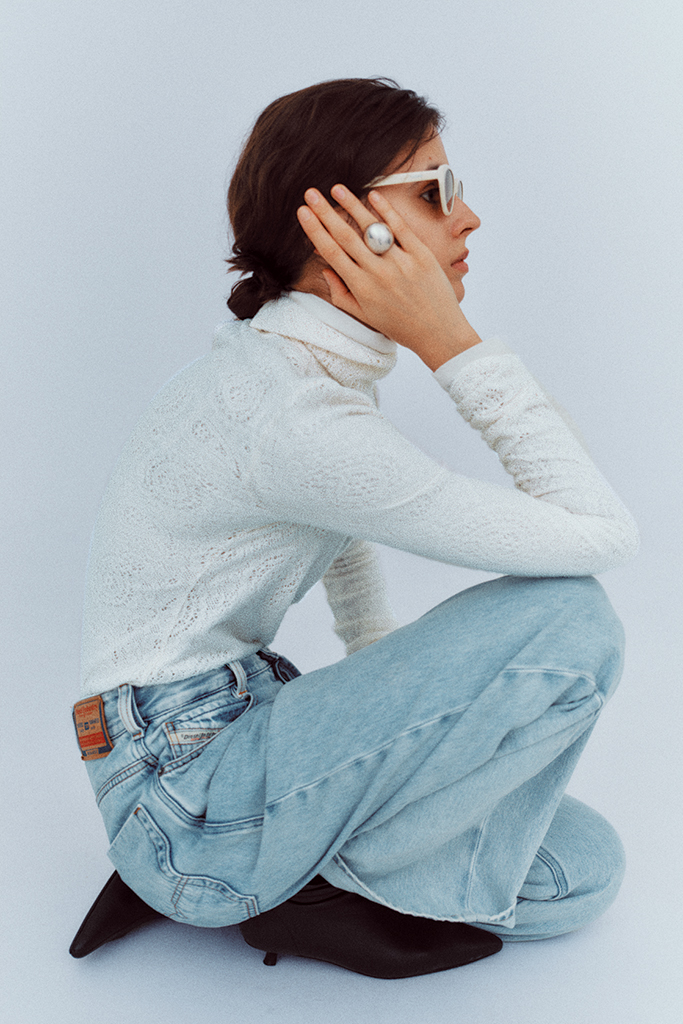 ライトブルーデニムパンツは着まわし。アイボリーペイズリーハイネックトップス 15,000円/KUME 中に着た白リブタートルネックトップス 13,200円/ハウント/ハウント代官山(ゲストリスト) サングラス 23,800円/CARIN(スタードリーム ジャパン) シルバーリング 51,700円/バルブス(ZUTTOHOLIC) ショートブーツ 30,800円/2.718(ガリャルダガランテ 青山店)