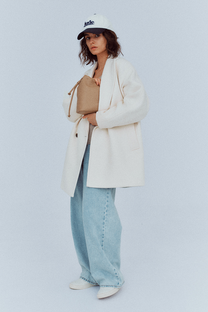 ライトブルーデニムパンツは着まわし。オフ白コート 99,000円/ソブ(フィルム) 中に着たベージュ2WAYパフスリーブファーニット 38,500円/NOBLE(ノーブル 有楽町マルイ店) 白×ブルーロゴキャップ 7,260円/TOKYO WEEKLY JOURNAL(バロックジャパンリミテッド) バッグ 42,900円/ROH SEOUL スニーカー 35,200円/YOAK(UTS PR)