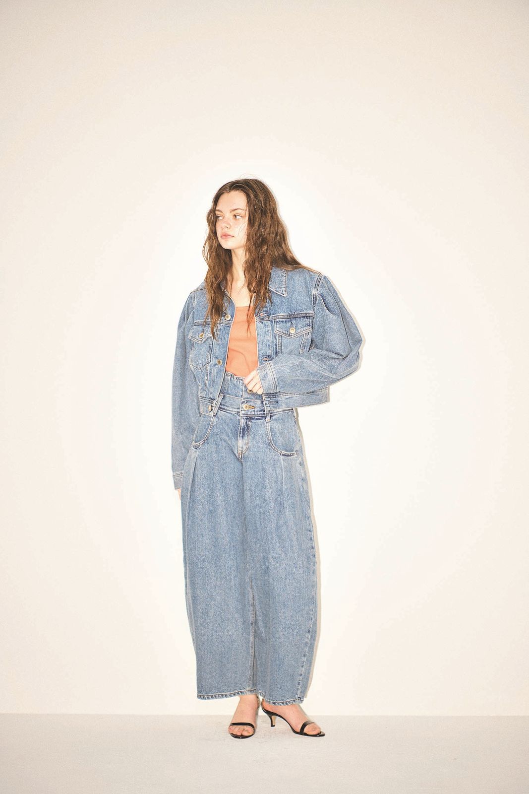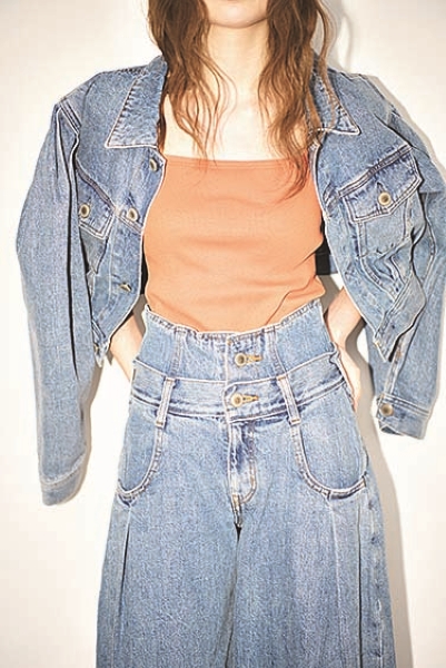 やさしくもインパクトを残す曲線フォルムで、デニムONデニムをリニューアル。肩パッドが入っているかのような幅広ジャケットは短め丈でだぶつきを防止。ウエスト位置をいっそう高く見せる重ねばき風のパンツは、立体感を生むタック位置にこだわりあり。