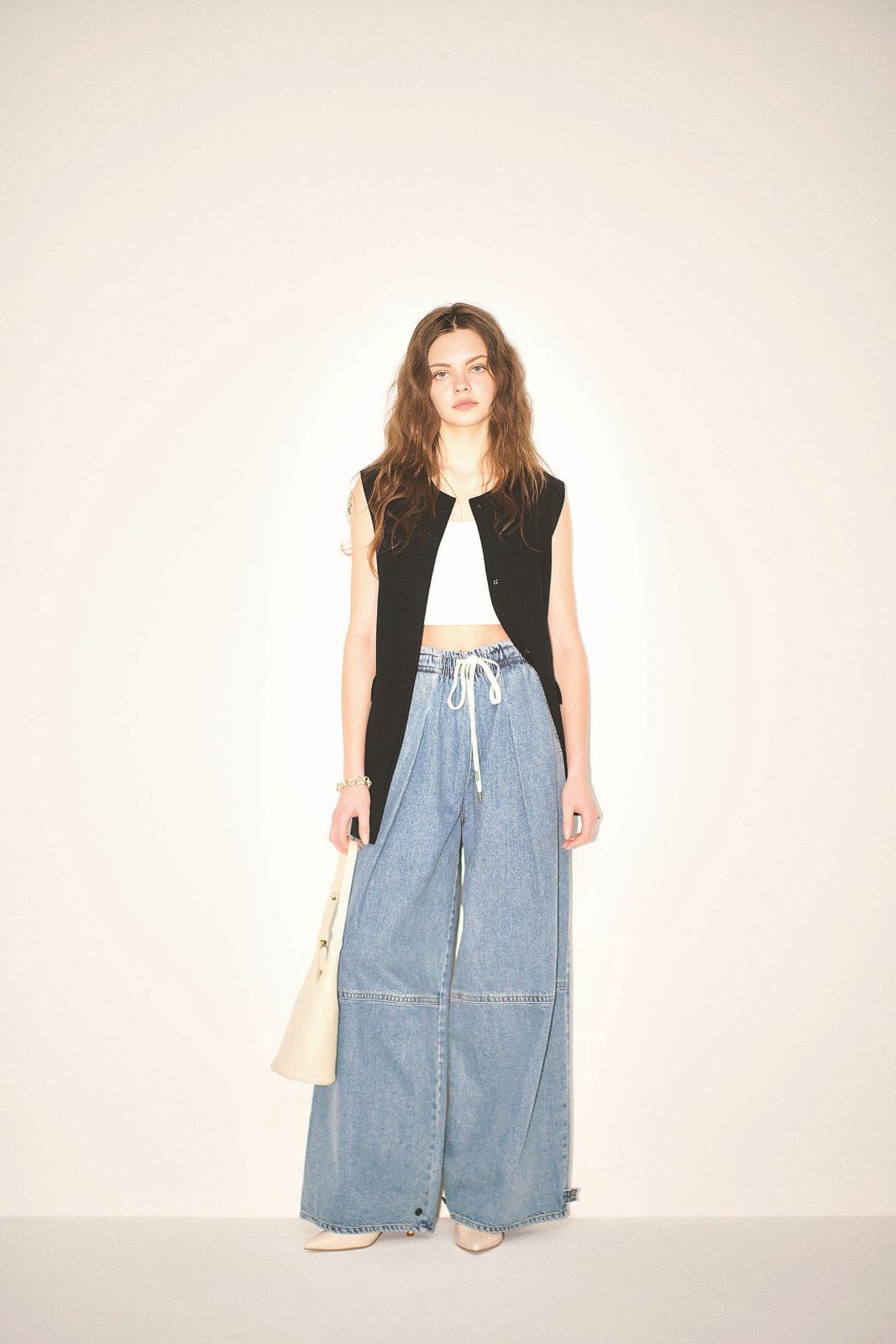 ドローストリングバルーンワイドパンツ 22,000円/SOMETHING(エドウイン・カスタマーサービス) ロングジレ 19,800円/ソージュ(ソージュ オンラインストア) ブレスレット 89,100円/BULBS(ZUTTOHOLIC) バッグ 33,000円/ROH SEOUL パンプス 8,910円/RANDA その他/スタイリング私物 すそを変えられるため、はく靴を選ばないのも利点。