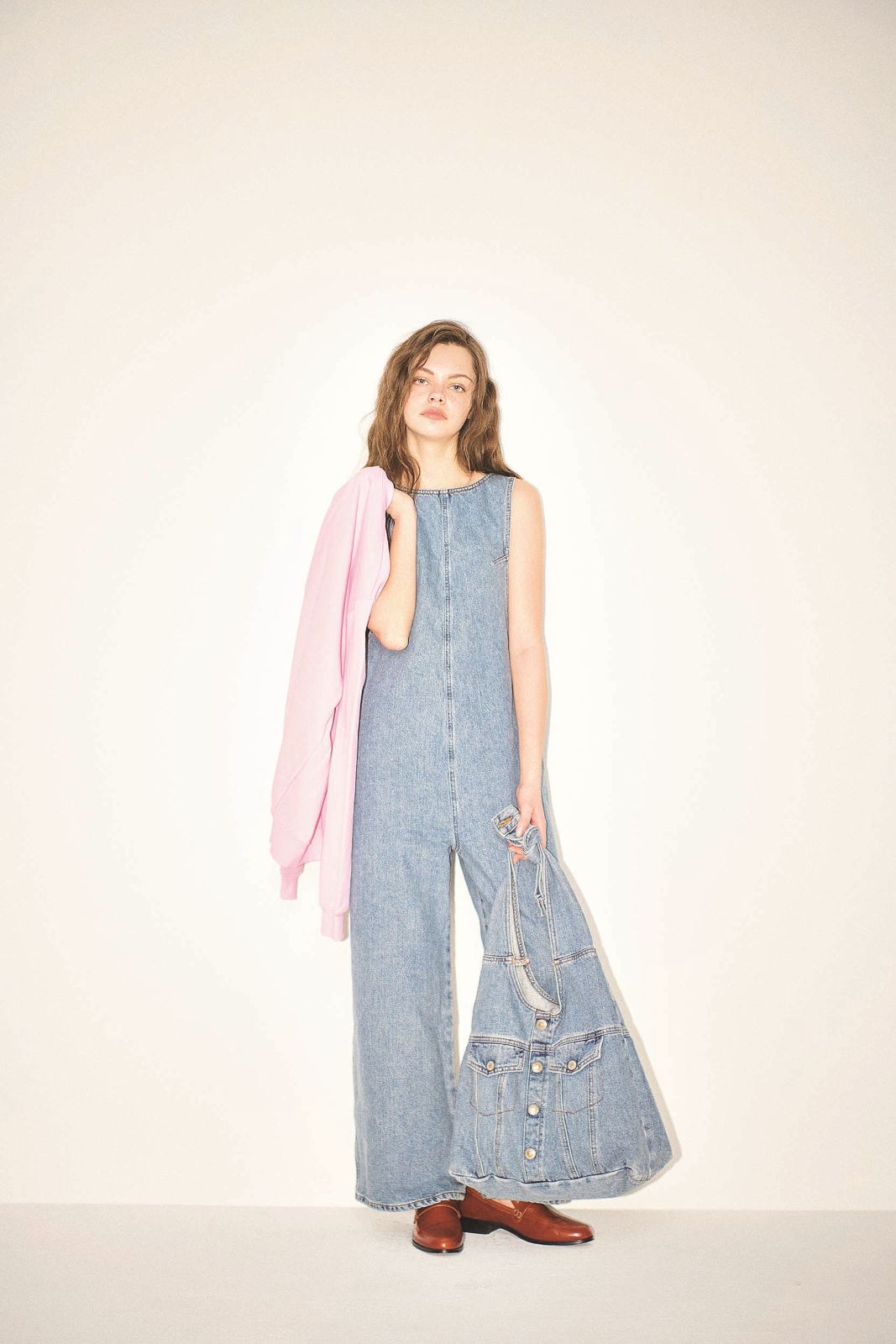 アメリカンスリーブオールインワン 25,300円、バッグ 16,500円/ともにSOMETHING(エドウイン・カスタマーサービス) 手に持ったスエットトップス 4,048円/ユナイテッドアスレ(キャブ) ローファー 17,930円/A de Vivre ワンピース同様、背中が開いた風通しのいい開放的なデザインは真夏にも最適。同色のデニムバッグをたずさえてさっぱりとした1枚にリズムづけ。