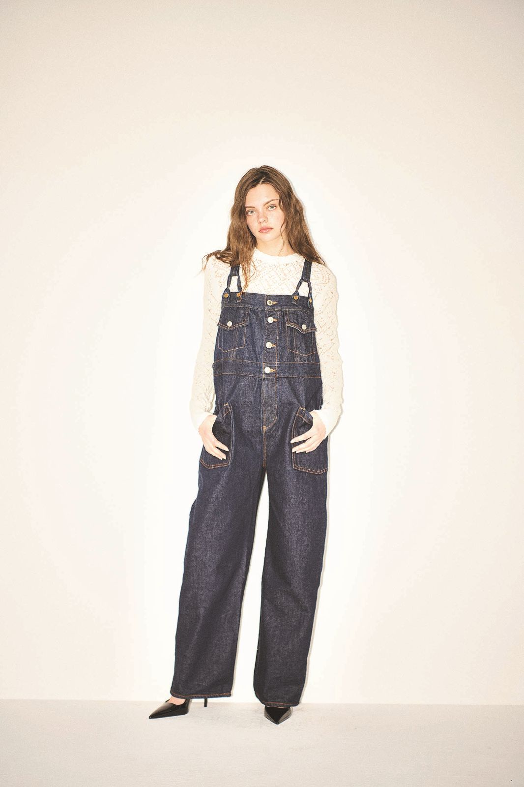 ボタンアップサロペット 26,400円/SOMETHING(エドウイン・カスタマーサービス) 透かし柄ニット 39,600円/ソブ(フィルム) パンプス 9,990円/MANGO ショルダーをとりはずせば、より洗練された都会的な雰囲気に。やや丸みを帯びたさりげないバルーンシルエットには、大きめのスクエアポケットを太ももの高い位置に配置。ゆとりのある形の華奢見えを誘導。