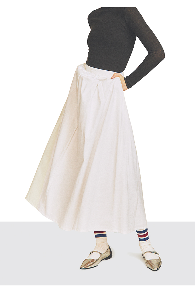 バランスが問われるひざ下丈のスカートには、タイツをはくのが好都合。ソックスのようにドライな風合いのリブ編みやニット素材を選べば、パンプス合わせでもありきたりにならない抜けを獲得。