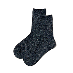 きらびやかな輝きのラメ入りソックス。ワントーンの足元になじみながら、ぽってりとした太ヒールをエッジィに転換。幅広ワイドの迫力を受け止めながら、ほっこりしがちなサロペットをハンサムな仕上がりに。