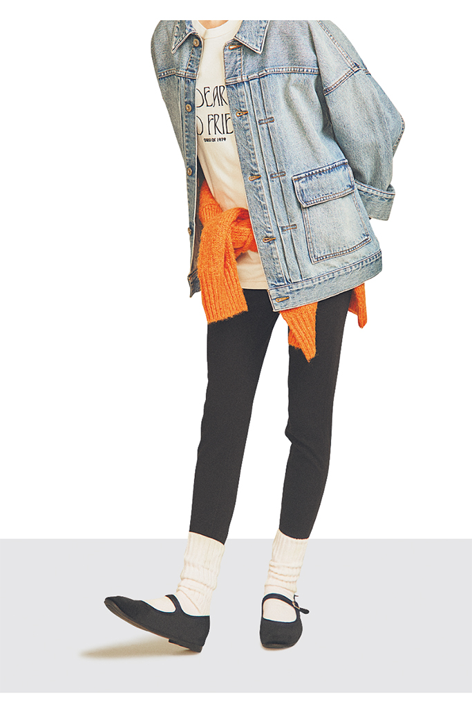 リブウール混ソックス 990円/ファミリーマート コンビニエンスウェア(FamilyMartお客様相談室) Gジャン 29,700円/MIESROHE(MIESROHE ルミネ新宿1店) ロゴTシャツ 15,400円/ジェーンスミス(アダム エ ロペ) パンツ 3,990円/UNIQLO 腰に巻いたニット 8,800円/Ungrid シューズ 11,550円/Rockfish Weatherwear (トヨダトレーディング プレスルーム)