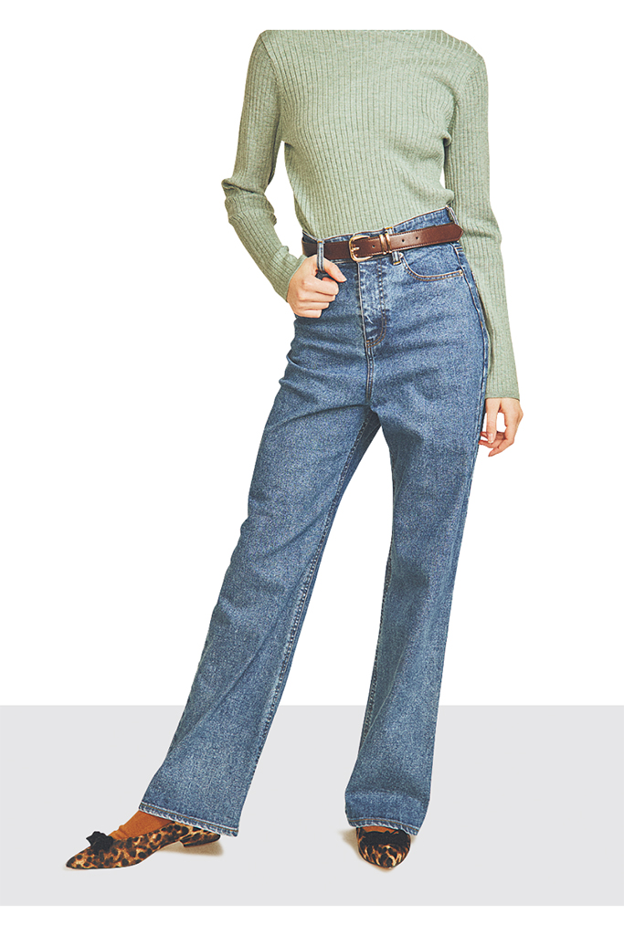 ブラウンソックス 990円/靴下屋(タビオ) グリーンタートルニット 6,600円/Ungrid デニムパンツ 33,000円/TSURU By MARIKO OIKAWA ブラウンベルト 3,990円/MANGO レオパード柄シューズ 13,750円/ル タロン(ル タロン 有楽町マルイ店)