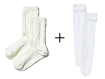 ざっくり編まれたケーブル地に、肌がほんのり透けるシアーを仕込んでぬくもりと洒落感を両得。軽やかにゆれるプリーツスカートの適度な重みに。ソックスの厚みに変化をつければ重ねてももたつきにくい。