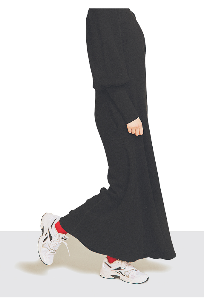 白よりもぼやけず、重厚感が増してシックな印象に。足首の華奢さをきわ立たせ、フレアスカートやスウェットパンツもすっきりと仕上げることができるため、スニーカーでスタイルアップがかなう。