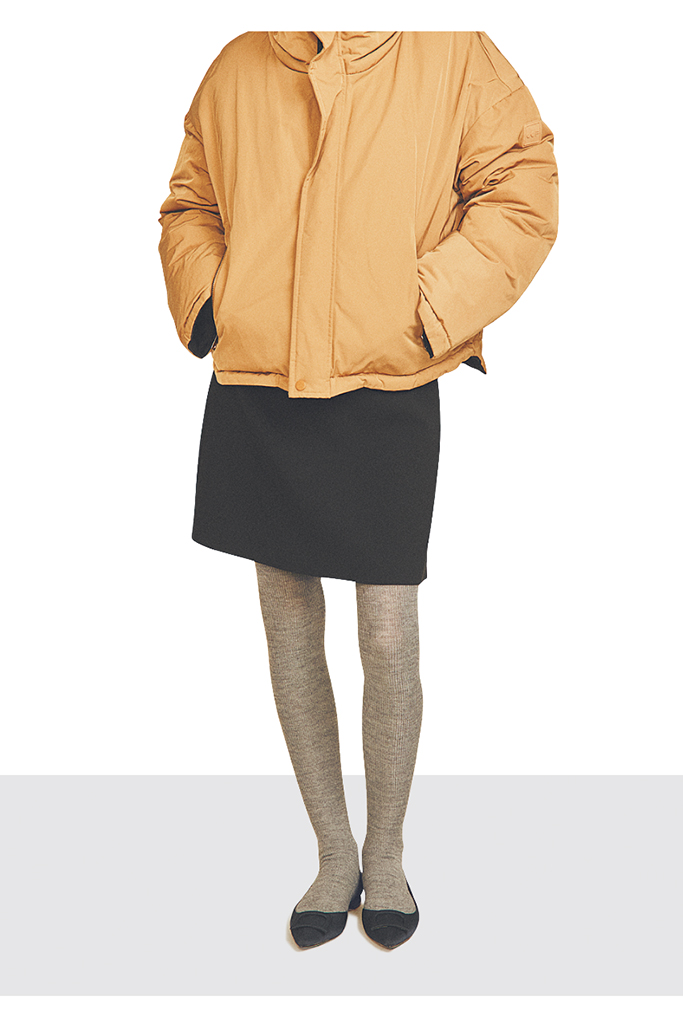 グレーリブ裏起毛タイツ 3,300円/靴下屋(タビオ) ベージュダウンコート 83,600円/OOF WEAR(ティースクエア プレスルーム) ミニスカート 24,200円/ルル・ウィルビー(アルアバイル) シューズ 27,500円/TSURU By MARIKO OIKAWA