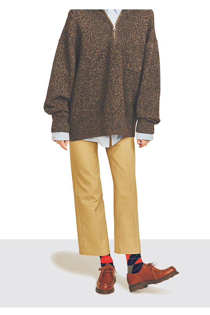 アーガイル柄ソックス 590円/UNIQLO ジップニット 73,700円/SEEALL(プラージュ 代官山店) 中に着たシャツ(メンズ) 3,990円/UNIQLO ベージュチノパンツ(別注) 14,300円/ディッキーズ(SLOBE IENA 自由が丘店) レザーシューズ 94,600円/パラブーツ(パラブーツ青山店)