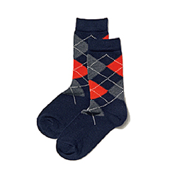 おじさん風のレザーシューズにさらなる重厚感を生むアーガイル柄。まじめなネイビーをベースに選べば、なつかしくも洗練された雰囲気に。発熱効果のある「ヒートテック」素材で、薄手ながらあたたかさとスマートな見た目を両立できる。