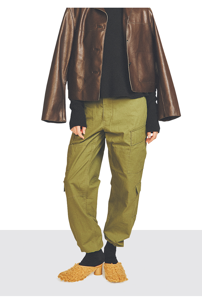 プレイフルなファーシューズに微光沢のベロアで品格を上乗せ。リッチな素材のかけ合わせを楽しめるのも、この季節ならでは。シックな黒を選べば、けば立ちやすいボリューミィな素材どうしもしつこくない。無骨なカーキパンツを和らげながら適度なハズし役に。