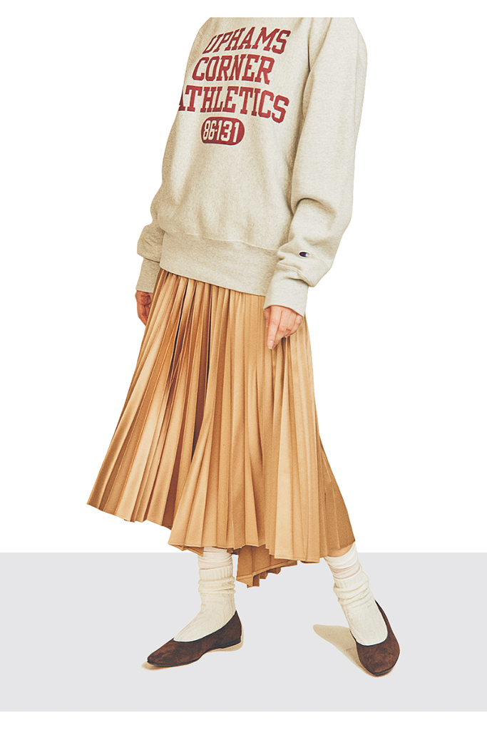 シアーソックス 参考商品/17℃(Blondoll 新丸の内ビル店) ケーブルソックス 590円/UNIQLO スエットトップス 12,980円/チャンピオン(ヘインズブランズ ジャパン カスタマーセンター) プリーツスカート 12,000円/プラステ ブラウンスエードシューズ 31,900円/ファビオ ルスコーニ(伊勢丹新宿店 本館2階 婦人靴)