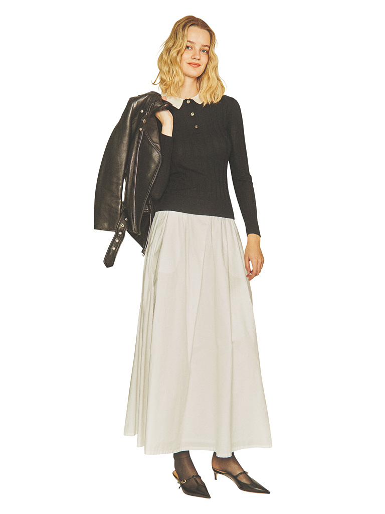 色もアイテム自体も甘い、ガーリーな白のフレアスカートは「広がりすぎない」形で甘さひかえめに。軽さのある白だから、どこかでほどよい「重み」を出すことがバランス良化のポイント。