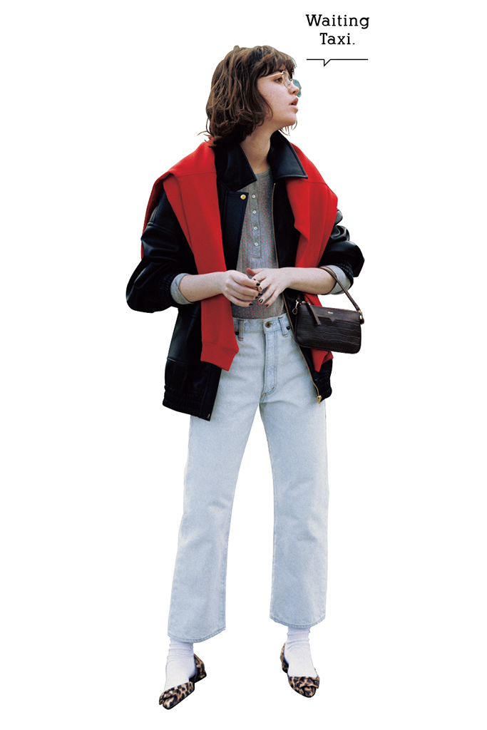 ライトブルーストレートデニムパンツ 30,800円/ボニーウーブン(クローバーズ) 黒レザーブルゾンジャケット 44,000円/ジャーナル スタンダード レサージュ(ジャーナル スタンダード レサージュ 銀座店) 肩にかけた赤ワイドスエット 3,157円/ユナイテッドアスレ(キャブ) グレー×ピンク花柄ロングTシャツ 20,900円/SEA(エスストア) ブラウンレオパード柄パンプス 28,600円/TSURU By MARIKO OIKAWA 眼鏡 25,800円/CARIN(スタードリーム ジャパン) ショルダーつきブラウンミニバッグ 9,900円/ヴュレ(キューズ) 白ソックス 3,300円/ブルーフォレ(LITTLE LEAGUE INC.)