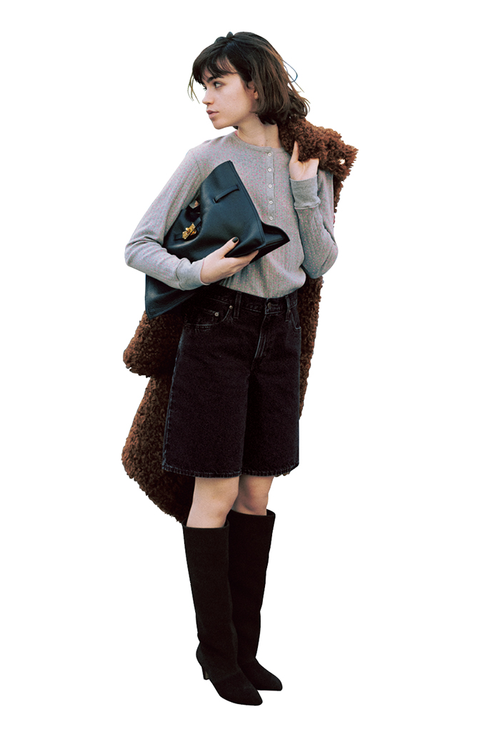 黒ハーフデニムパンツ 9,900円/Levi’s®(リーバイ・ストラウス ジャパン) 手に持ったブラウンノーカラーボアロングコート 70,400円/JAKKE(ジャック・オブ・オール・トレーズ プレスルーム) グレー×ピンク花柄ロングTシャツ 20,900円/SEA(エスストア) ブラウンスエードロングブーツ 121,000円/ダブルスタンダードクロージング(フィルム) 黒レザーバッグ 35,200円/ヴィオラドーロ(ル タロン 有楽町マルイ店)